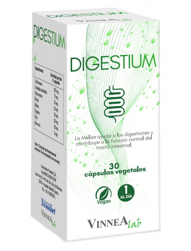 L-Glutamina: 150 mg, Antiaglomerantes (fosfato tricálcico, celulosa, estearato de magnesio, silicato de magnesio, dióxido de silicio), Almidón de maíz, Complejo enzimático (Maltodextrina fermentada de arroz rica en enzimas digestivas): 75 mg, Poleo menta extracto seco (Mentha pulegium L ., hoja ): 50 mg, Hinojo extracto seco (Foeniculum vulgare M. , fruto): 50 mg, Melisa extracto seco (Melissa officinalis L ., hoja): 30 mg, Papaina: 30 mg (sulfitos ), Piña (Ananas comosus L. , fruta y tallo): 30 mg, Aloe vera extracto seco (Aloe barbadensis M., gel): 5 mg.